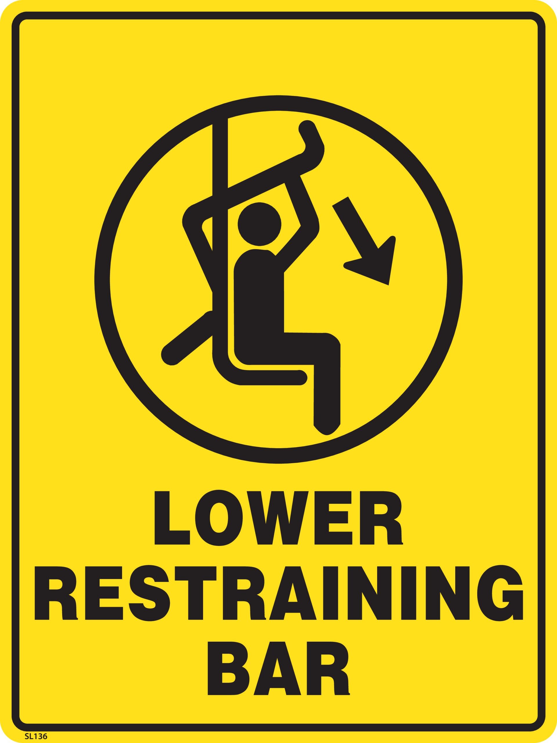 Ensure rider safety and compliance with the Lower Restraining Bar lift sign, an essential reminder for passengers to lower the restraining bar immediately after loading the chairlift. This sign plays a critical role in accident prevention by reinforcing the importance of lowering the safety bar for the entire ride until unloading.