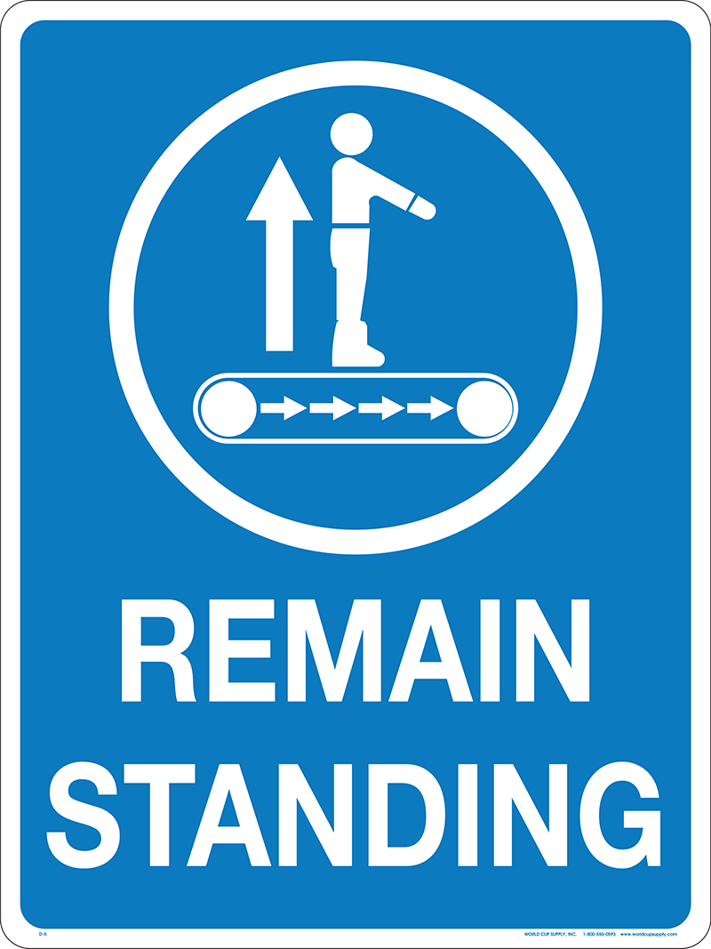 The Remain Standing Ski Lift Sign provides a clear safety instruction for skiers and riders using surface lifts such as T-bars, platter lifts, and rope tows. This sign reminds passengers to remain standing at all times during the ride, reducing the risk of falls and ensuring safe lift operation.