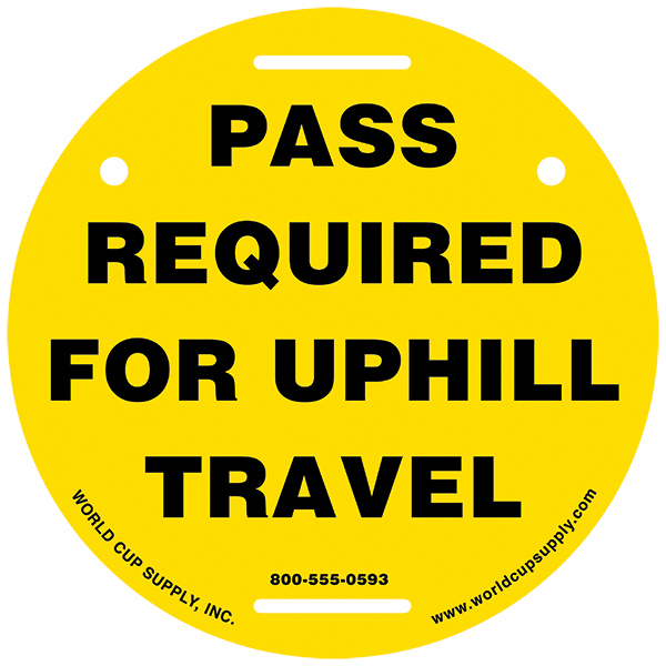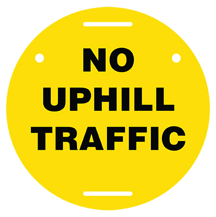 Text: NO UPHILL TRAFFIC, NO UPHILL TRAFFIC AFTER DUSK, PASS REQUIRED FOR UPHILL TRAVEL